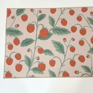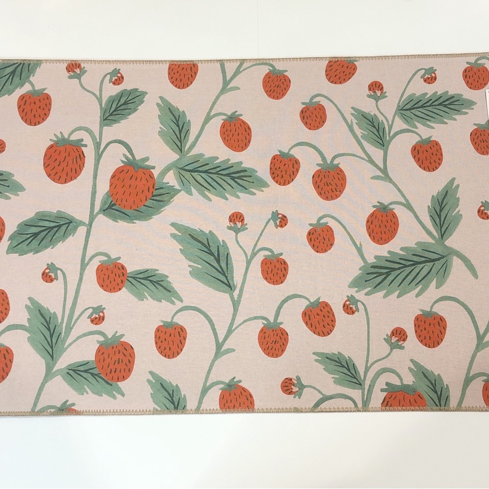 NWT Rifle Paper Co. Atelier Floral Non-Slip Runner Rug. Add a dose of colorful florals to any corner with a rug from our Atelier collection, created with a skid-resistant backer, perfect for in front of the sink or in an entryway. Vivid colors are achieved through printing the design on a powerloomed base. Part of our Rifle Paper Co. × Loloi collection. 2'3" x 3'9", 100% polyester, printed power-loomed, skid-resistant backing, 0.19" thickness, bright colors, fine details and durability are achieved in this rug, which is made of power-loomed polyester and finished with a printed design. Pink with red strawberry vine print throughout. This would be perfect in a little girl's room, nursery, playroom, bathroom, hallway, laundry room, closet, entryway, or anywhere else you can think of! Will be rolled when shipped.