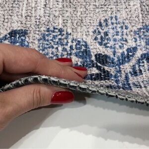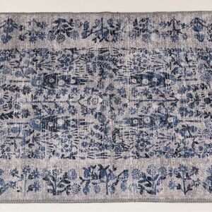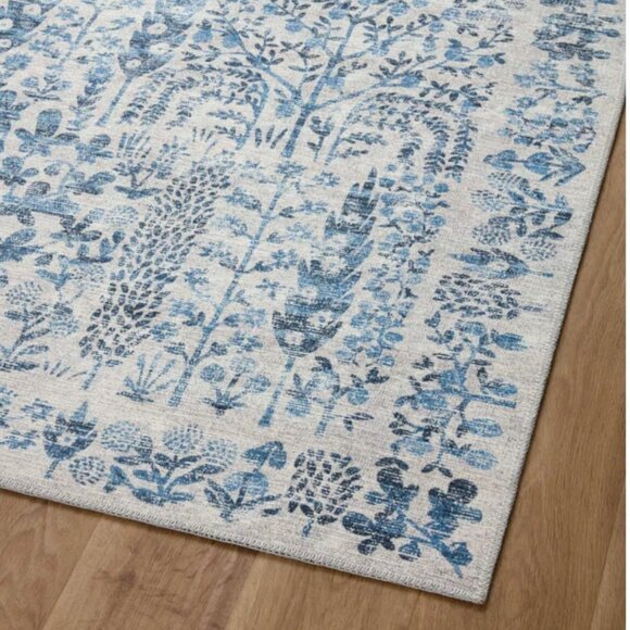 NWT Rifle Paper Co x Loloi Maison Grove Printed Rug in Blue. The tall trees of our Grove rug bring to mind rows of Cypress trees dotting the landscape in Tuscany. The Maison rug collection is a power-loomed construction with a low pile that will never shed, perfect for adding a delightful accent to even the most heavily-trafficked spaces. Part of our Rifle Paper Co. × Loloi collaboration. 2'3" x 3'9",, 100% polyester face, printed power-loomed, miscellaneous fiber backing, 0.19" thickness. Light grey with blue whimsical print throughout, easy to clean, will be rolled when shipping. This would be great in a little girl or boy room, playroom, bathroom, hallway, laundry room, closet, entryway, or anywhere else you can think of! So fun and pretty!