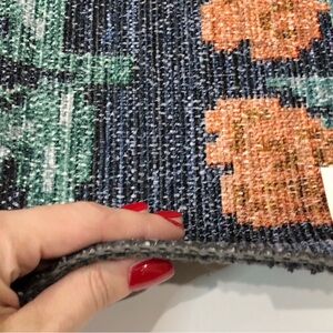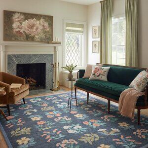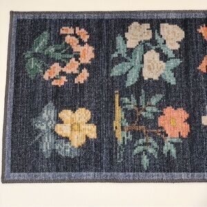 NWT Rifle Paper Co. Rosa Hawthorne Power Loomed Rug in Navy. The Hawthorne rug makes a statement with its simplicity, featuring a grid of large scale blooms. The Rosa collection was inspired by folk art textiles that showcases the geometry of the traditional weaving technique. We’ve brought it to life with a power-loomed construction that is durable but still velvety-soft. 2' x 5' rug, 100% polyester, 0.5" pile, printed power-loomed polyester and finished with a printed design. Really pretty blue with bold and colorful rose floral pattern throughout, easy to clean, will be rolled when shipping. Very vintage with a bit of cross stitch inspiration. This would be great in a boy's or girl's room, playroom, bathroom, laundry room, closet, entryway, or anywhere else you can think of! So pretty!