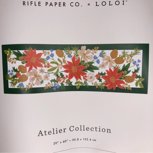 NWT Rifle Paper Co. Atelier Holiday Collection Multi Non-Slip Runner Rug. Add a dose of colorful florals to any corner with a rug from our Atelier collection, created with a skid-resistant backer, perfect for in front of the sink or in an entryway. Vivid colors are achieved through printing the design on a powerloomed base. Part of our Rifle Paper Co. × Loloi collection. 20" x 60", 100% polyester, printed power-loomed polyester and finished with a printed design. White with green border and pointsetta and pinecone floral pattern throughout, easy to clean, will have to be rolled when shipping. This would be great in a boy's or girl's room, playroom, bathroom, laundry room, closet, entryway, or anywhere else you can think of! So pretty and classic!