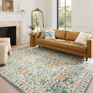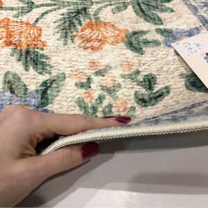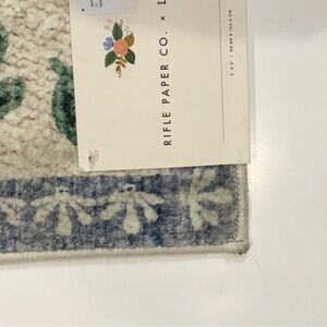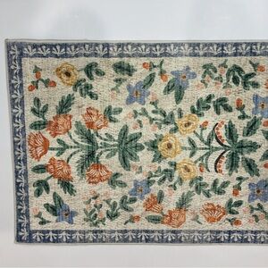 NWT Rifle Paper Co. Eden Mughal Garden Power Loomed Runner Rug in cream. Traditional textile designs from India inspired the florals of the lush garden scene on our Mughal Garden Rug. The Eden collection was made with Loloi’s CloudPile ™ construction, a thick and soft fabrication that combines the best of affordable printed rugs with the plushness of a pile. Part of our Rifle Paper Co. × Loloi collaboration. 2' x 5', 100% polyester, cotton backing, printed power-loomed, 0.38" pile height, very soft and plush, ivory with bold multi-colored floral print and border throughout, will be rolled when shipped. This would be great in a little girl's room, playroom, bathroom, entryway, closet, hallway, laundry room or any where else you can think of! So pretty! Brand new, but a dust stain in one of the corners (see last pic for up close).