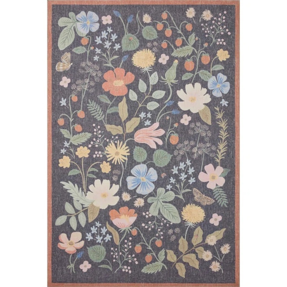 NWT Rifle Paper Co. x Loloi Cotswolds Strawberry Fields Power-Loomed Rug in black colorway. The blooming flowers, sweet berries, and fluttering butterflies of Strawberry Fields are set in a statement-making scale and enchanting colorways. This printed rug is powerloomed of 100% polyester pile and designed to withstand foot traffic. This printed rug is power-loomed of 100% polyester pile and designed to withstand foot traffic. Part of our Rifle Paper Co. × Loloi collection. 2' x 5' runner, 100% polyester, printed power-loomed, canvas backing, 0.13" thickness, bright colors, fine details and durability are achieved in this rug, which is made of power-loomed polyester and finished with a printed design. Soft black with red border and colorful flowers and butterflies. This would be perfect in a little girl's room, nursery, playroom, bathroom, hallway, laundry room, closet, entryway, or anywhere else you can think of! Will be rolled when shipped.