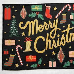 Add instant cheer to your entryway with this vibrant and whimsical Christmas rug! Featuring a bold black background and golden cursive “Merry Christmas” lettering, this festive mat is adorned with colorful holiday icons—candy canes, stockings, ornaments, wrapped gifts, holly, bells, and pine branches. Perfect for welcoming guests or adding seasonal charm to your home decor.