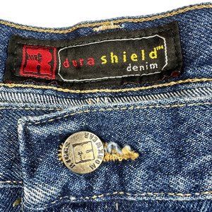 The Riggs Workwear Carpenter jeans by Wrangler are for the working carpenters or the weekend warrior. These jeans feature the exclusive room2move? fit which means a better fit in the seat, thigh, knee and bottom leg opening. The action gusset allows for better movement. The patented leather tape measure reinforcement on right front pocket allows for easy access without catching on your pocket. The 1000 Denier Cordura lined back pockets reinforced at stress areas will ensure that your pants will keep up with you on any job. Right side hammer loop, tool pocket detail, 13-inch deep front pockets. Fabric is 100% cotton. Tag measurement is 48" x 42. Actual measurement is 47" x 32"