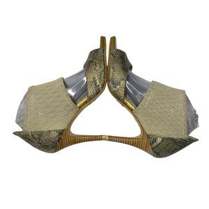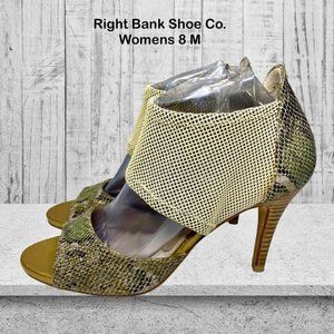 Keywords: Right Bank Shoe Co., womens heels, size 8M, snake print, open toe, ankle strap, dress shoes, party heels, stylish heels, fashion footwear, gold accents, multi color, womens fashion