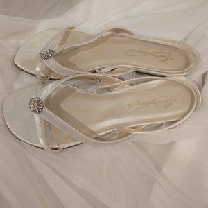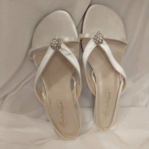 This is a flat Satin sandal with a slight wedge that becomes a glamorous pick for an evening event thanks to the sparkling crystals encrusted on the slender toe strap. This sweet shoe has a sling back strap and is white satin with flower shaped Rhinestones with 6 baby pearls. Crystal flowers bloom over the toe strap of a flexible sandal in lustrous satin in size 5.5 Brand New