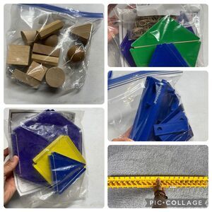 -2 math balance scales with weights (all pieces required to assemble balance included)- 2 sets of geometry panels (1 set is new and opened, the other is gently used)-1 incomplete set of geometry solids (missing 1 solid)