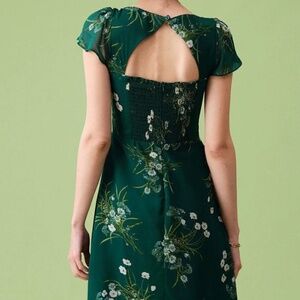 This Rihoas dress is a perfect dupe for the Reformation Rosi dress. Emerald green color, square neckline, beautiful white floral print, open back, zip closure, sheer fluttery sleeves, lined. Women's size medium. Smoke free home. No rips, stains, tears, etc. Great used condition.