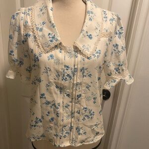 New with tag, Rihoas brand feminine cream & blue blouse. It is so pretty with pleats and lace accents. It is lightweight and 100% polyester. I have measurements in the pictures and it is a size medium. 🌷