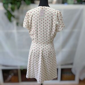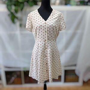 White and red polka dot dress with button front and short sleeves, featuring a V-neckline and a flowy, A-line silhouette.