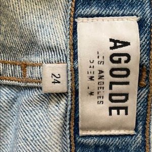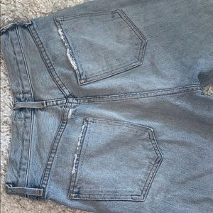 100% cotton. Distressed. Ankle length. Button fly. Size 24. 11” rise from crotch to waist hem. Natural blue denim color (Renewal). Back right belt loop torn. Great fit around waist. Snug around thighs.