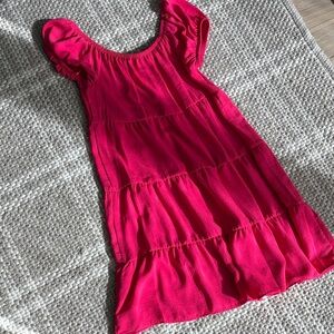 Chic pink mini dress with ruffled tiers. Perfect for casual outings.