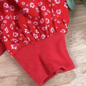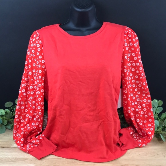 Riley & Rae Reagan Printed-Sleeve Sweater. Geranium Red. Cotton/polyester