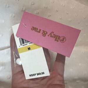 New with tags, Swiss dot and textured, lightweight with lined bodice and semi-sheer Sleeves, elastic 3/4 puffy sleeves, keyhole back with three buttons, pleated high neck collar, tie front, side neck or leave simply untied