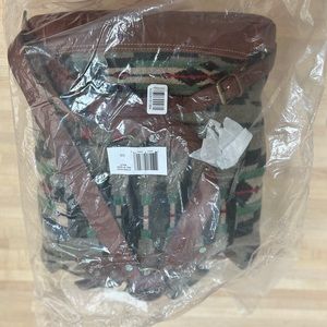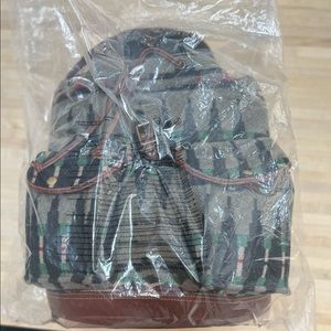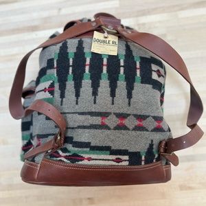 Riley Southwestern Rucksack. Ralph Lauren RRL. Leather top handle. Two front snapped pockets, leather trimmed base, interior zip pocket.