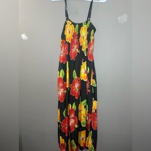 Stunning floral maxi dress with vibrant red, orange, and yellow flowers. Perfect for a bold and colorful look.