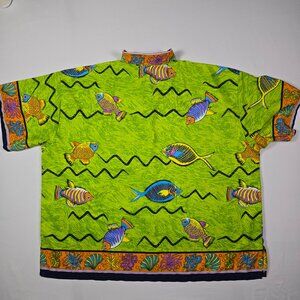 Bright, bold, and beach-ready! This Rima International tropical button-up shirt in size 2XL features a fun multicolor fish print on a vivid green background. Lightweight 100% Terivoile fabric makes it perfect for summer, vacations, and festivals. Pre-owned and in excellent condition.