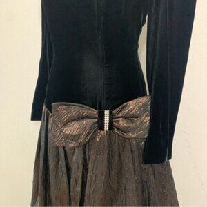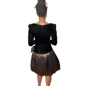 The upper part features a fitted, black velvet bodice with long sleeves, adding a luxurious texture to the look. The neckline is a soft, rounded shape that enhances the overall refinement of the outfit. The skirt contrasts beautifully with the top, made from a shimmery metallic fabric in a bronze-gold hue. It has a voluminous, bubble-shaped silhouette, gathering just above the knee, creating a unique and eye-catching effect. The skirt is accentuated by a large, stylish bow at the waist, which has a decorative buckle detail in the center, adding a touch of glamour.