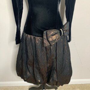 The upper part features a fitted, black velvet bodice with long sleeves, adding a luxurious texture to the look. The neckline is a soft, rounded shape that enhances the overall refinement of the outfit. The skirt contrasts beautifully with the top, made from a shimmery metallic fabric in a bronze-gold hue. It has a voluminous, bubble-shaped silhouette, gathering just above the knee, creating a unique and eye-catching effect. The skirt is accentuated by a large, stylish bow at the waist, which has a decorative buckle detail in the center, adding a touch of glamour.