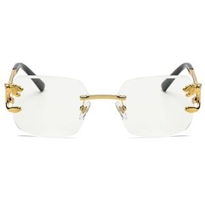 Keywords: rimless sunglasses, clear lens sunglasses, gold sunglasses, designer sunglasses, fashion sunglasses, statement sunglasses, luxury eyewear, gold accent glasses, rimless glasses, clear glasses, fashion eyewear, stylish sunglasses, unisex sunglasses