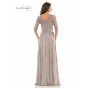 Indulge in timeless elegance with the Rina Di Montella RD2760 dress. Crafted from delicate lace and soft chiffon, this A-line masterpiece features a flattering V-neck, 3/4-length sleeves, and intricate embroidered accents. It radiates sophistication and grace, perfect for evening events, mother-of-the-bride occasions, and celebrations.