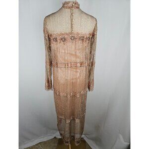 tags; Art Deco, flapper, romantic, feminine. Beaded dress, intricate dress, old money, beaded dress, vintage silk dress, formal dress, Rina Di Montella, lace dress, evening wear, peach dress, gold dress, floral detailing, elegant dress, vintage clothing, theater clothing, costume designer, theater costume, show costume, costume curator, theatrical designer, romantic, feminine
