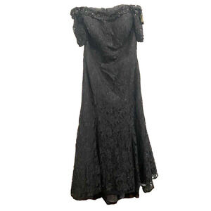 Looking for a dress that will make you stand out at your next formal event? Look no further than Rina di Montella's black lace off-shoulder maxi dress. This ball gown style dress is perfect for weddings, parties, or any formal occasion. Featuring pebbled flowers trims and sequins, this dress is sure to catch the eye of everyone in the room. The short sleeves and off-shoulder neckline add a touch of elegance to the dress, and the long length is perfect for winter, fall, or spring events. Dry clean only.