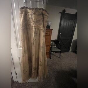 Chic strapless gown by Rina diMontella. Cream base with silver embellishments. Perfect for formal events. Great for MOB or MOG