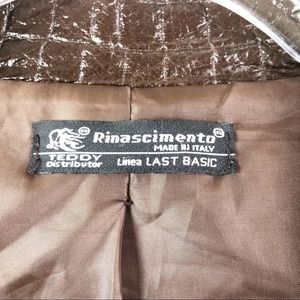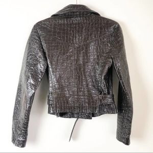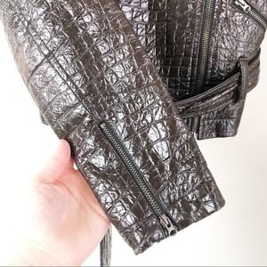 Short faux leather moto jacket by Rinascimento. Brown gator print. Very lightweight, Cotton blend. Doesn’t feel like traditional faux leather. Women’s size Small, measures 18” pit to pit, 19” shoulder to hem, and 24” sleeve. Good used condition, one small spot under the belt where the color has rubbed off and the collar has a tiny bit of pilling. Very light.