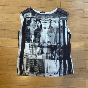 This awesome top is slight off white in back in a super soft cotton and a high fashion silk graphic in front. Dress up or wear casual. Excellent smoke free condition.
