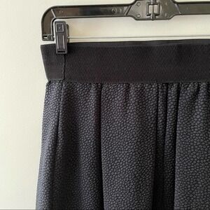 Black and navy textured elastic waist fit and flare skirt. Size medium. Good condition, there is one place where the seam unraveled a little bit (pictured). No stains. 100% polyester.