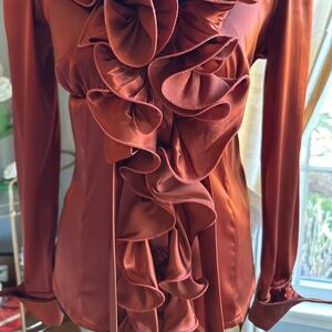 Rinascimento Satin Ruffled Front Button Down Blouse in Burnt Orange NWT