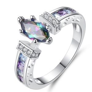 This ring features a lab created rainbow topaz gemstone hand set into a classic plated sterling silver setting with cubic zirconia accents.