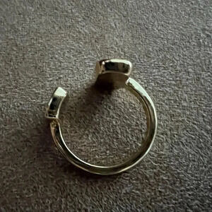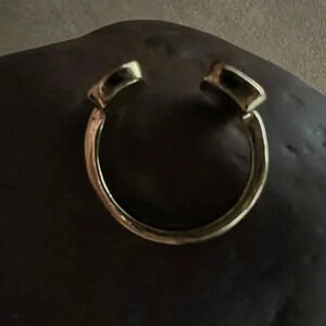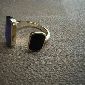 Ring- open design, 2 faux rectangular stones, one lavender color and one smaller, black color. Size: 7. Gold tone band. Ring is open, size can be adjusted. Brags new, never worn. NWOT.