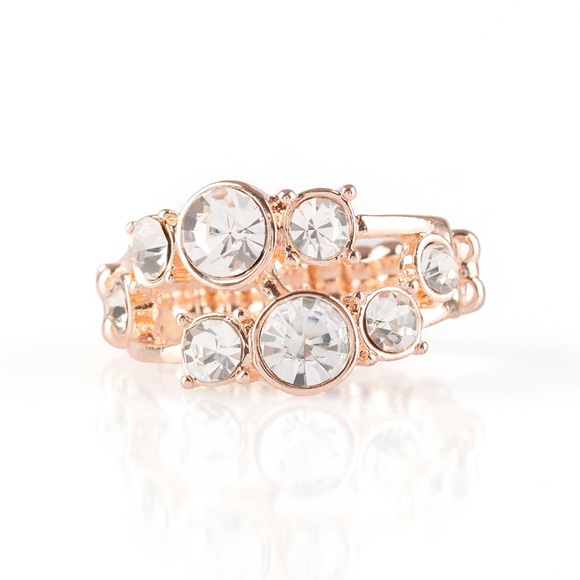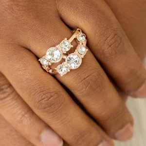 Rows of glittery white rhinestones connect across the finger, coalescing into a glamorous band. Features a dainty stretchy band for a flexible fit.
