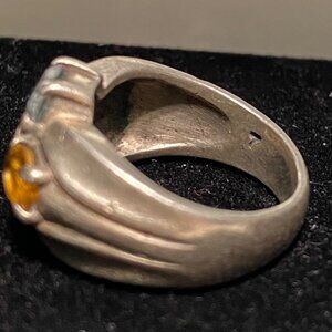 This Sterling Silver Stamped 925 ring is a vintage treasure. The ring showcases 5 faceted stones - Blue Topaz, Amethyst, Tourmaline, and Citrine, set in a size 6 band. Made by Stamped Heart Maker’s Mark, it's a unique piece for any women's collection.