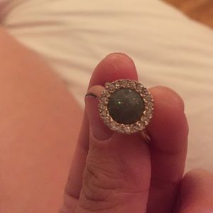 Cute little ring with greenish stone in the middle with tiny rhinestones arround it