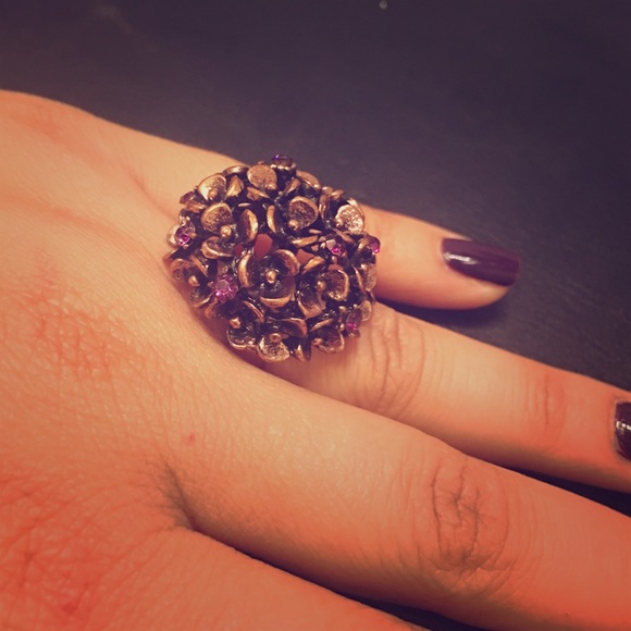 Copper antiqued adjustable ring with purple rhinestones