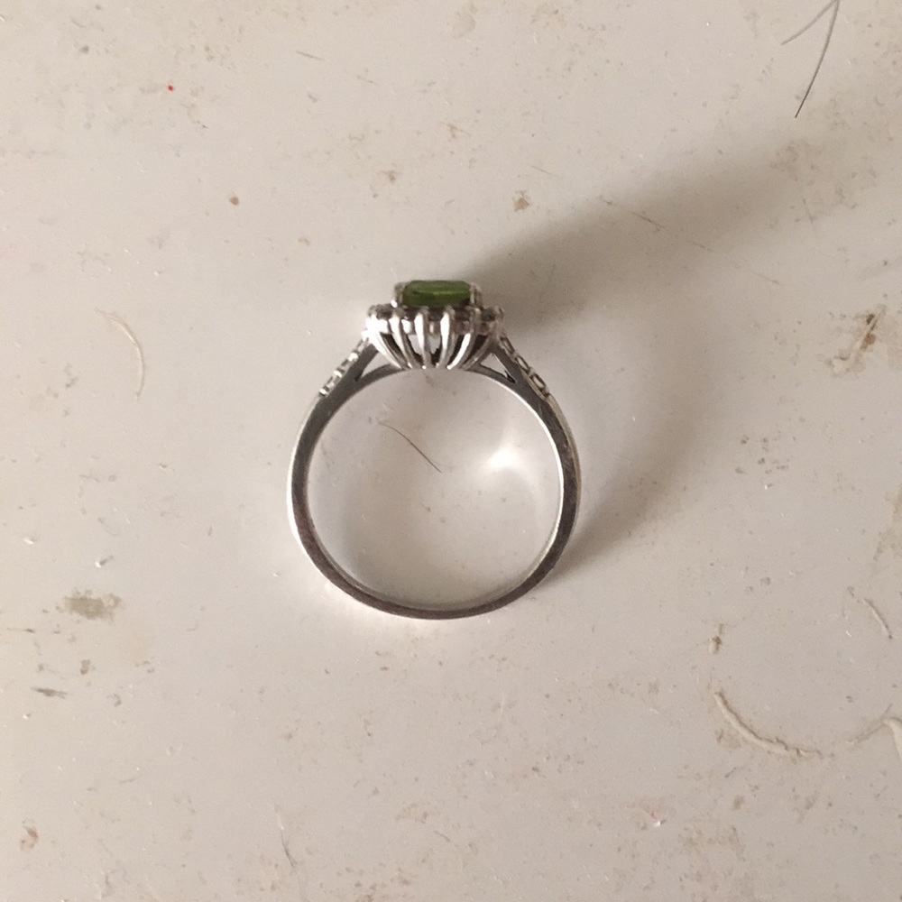Very beautiful ring. Peridot gem in the center and diamonds surrounding it.