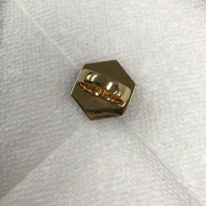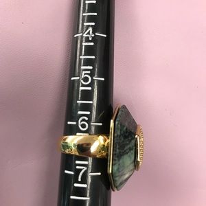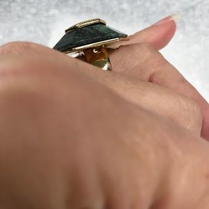 Cocktail ring, green stone with diamond accents and gold tone setting.