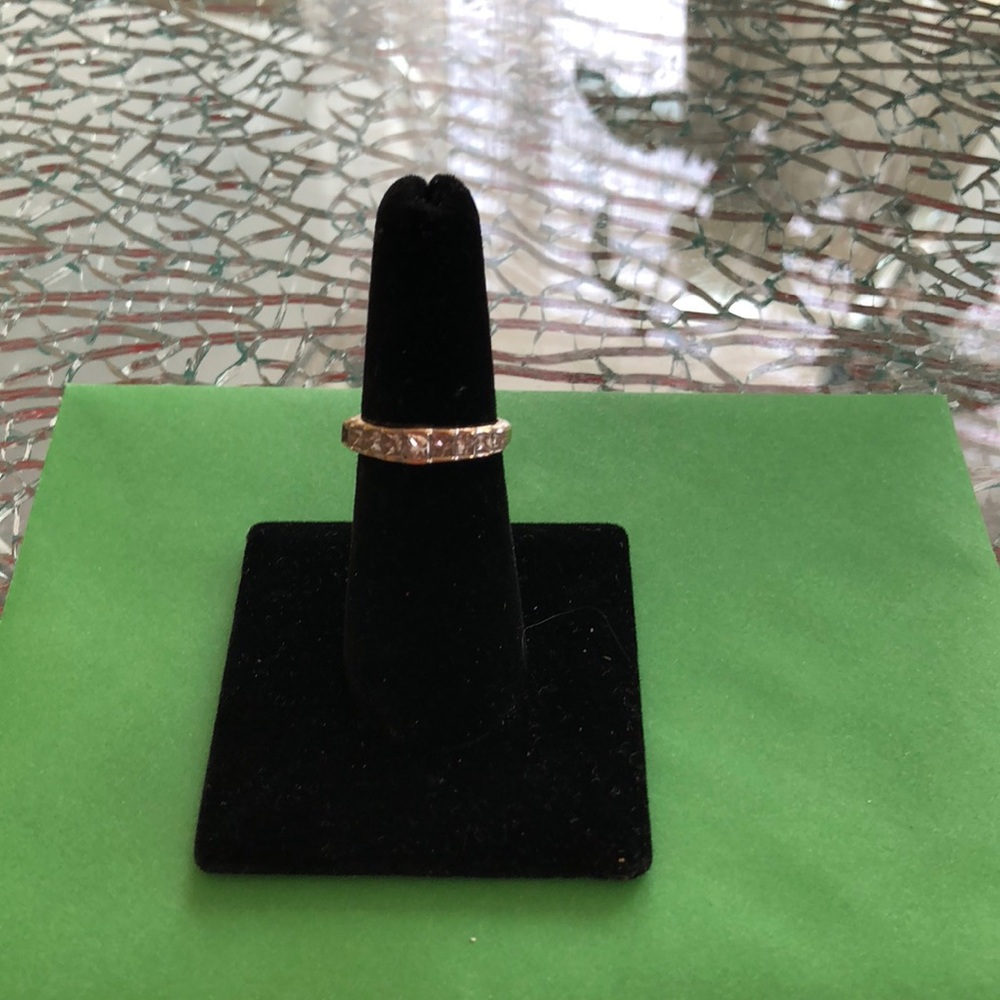 @hotlikefire247 hi. Sorry, it’s hard to take a picture, but it’s 14 carat gold, ,I don’t know carat weight, if u are interested I can’t go to jewelry site to find out. 9 diamond stones