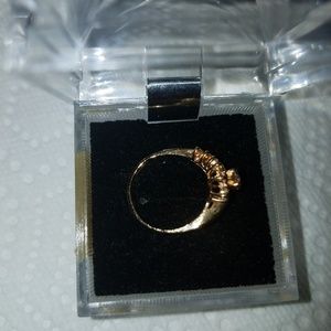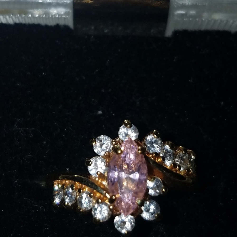 10k gold electroplate ring size6 pink marquise center stone clear round stones surround in clear plastic box from HSN