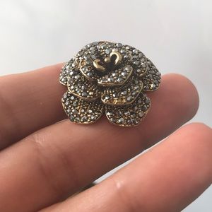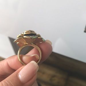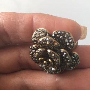 Gorgeous flower ring size 7, missing couple of stones but due to the color you won’t even notice. Look at pictures carefully. Doesn’t tarnish or change color, bronzish gold