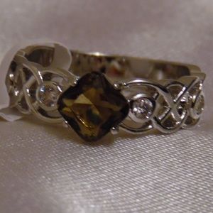Stuning braided rhodium with white topaz and a smokey quartz center stone.