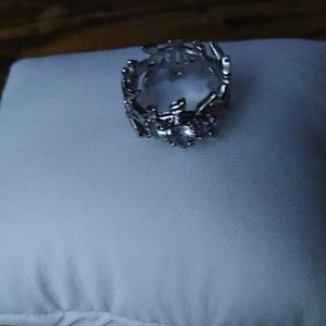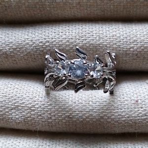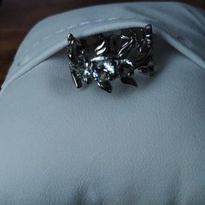 Silver, center Stone, leaf details all the way around.