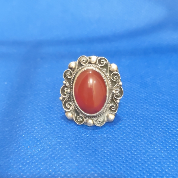 Silver ring embellished with orange light brown imitation stone. Size 10.