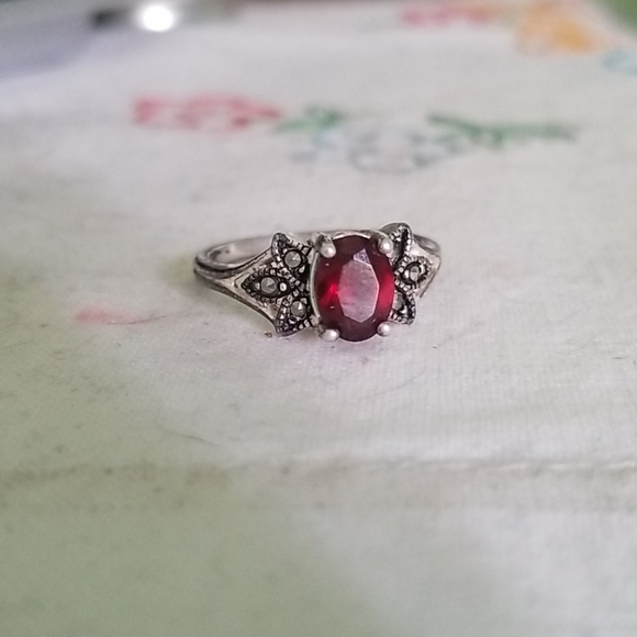 Costume jewelry ring with dark red stone in center