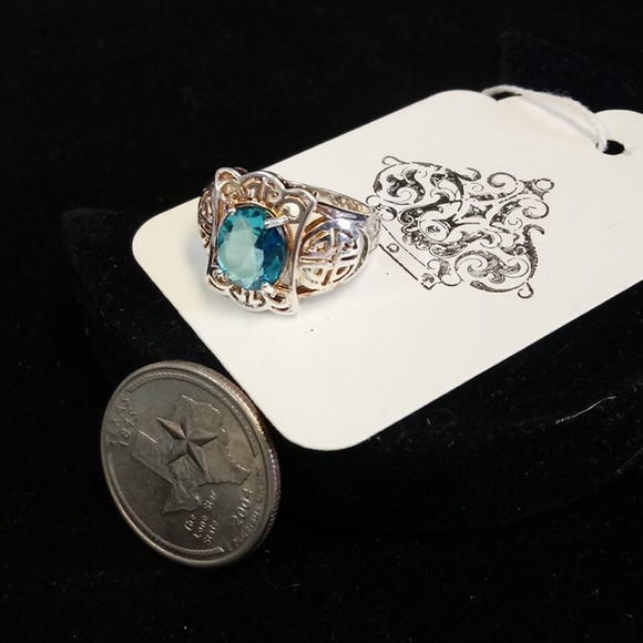 Oval cut blue topaz w/oriental design