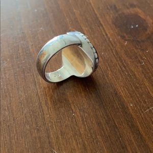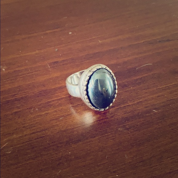 The ring is made of silver and the stone is an onyx color. You can see the pictures for details.
