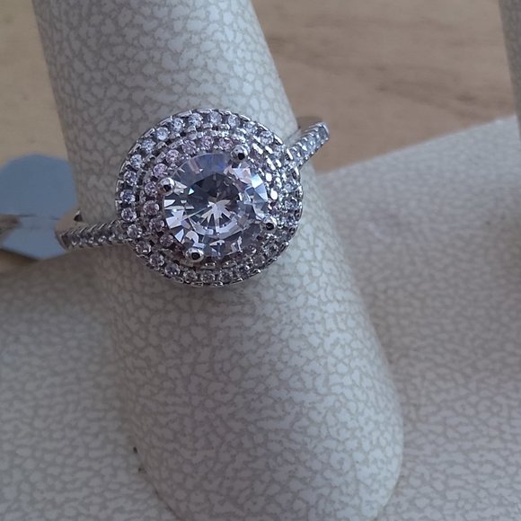 Double Halo surrounds a 2 cttw solitaire diamond simulant